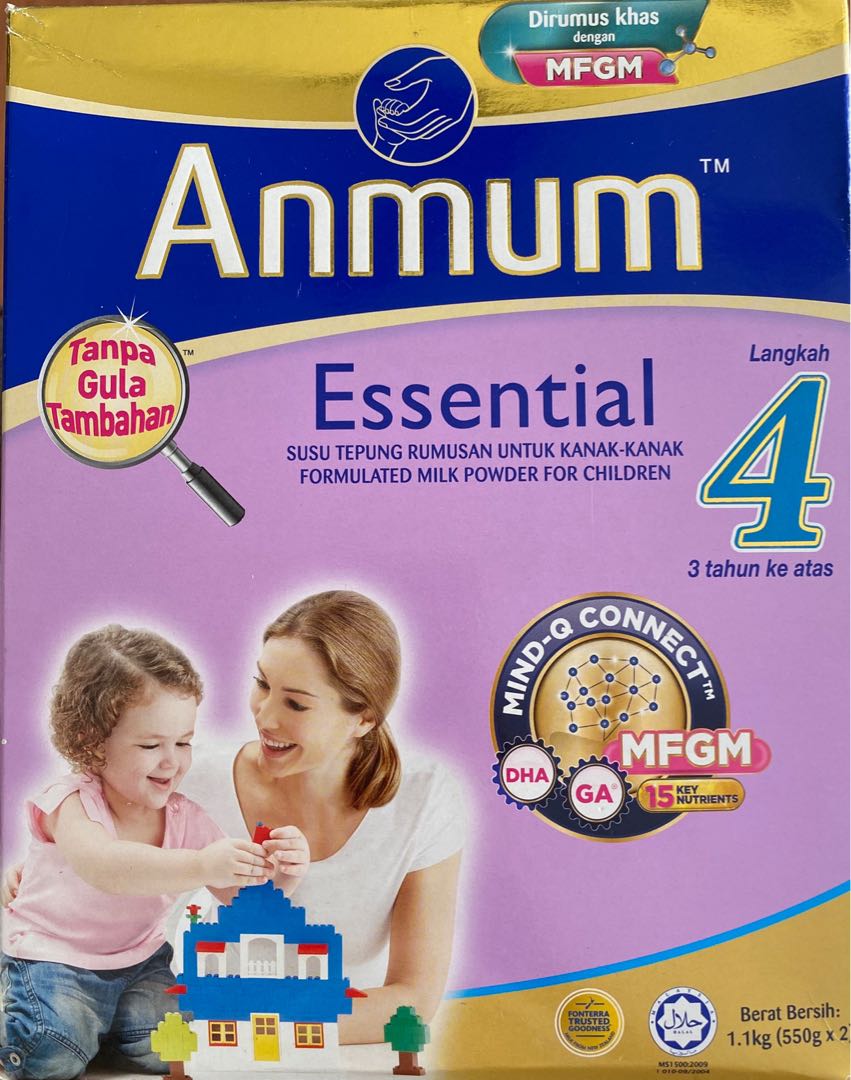 Anmum Essential Step 3 Plain 12kg x 8. Anmum Essential Step 4 Plain 16kg. Untuk perkembangan sel-sel otak bayi supaya sentiasa berhubung ia diperkaya dengan formulasi DHA dan Nuelipid.
